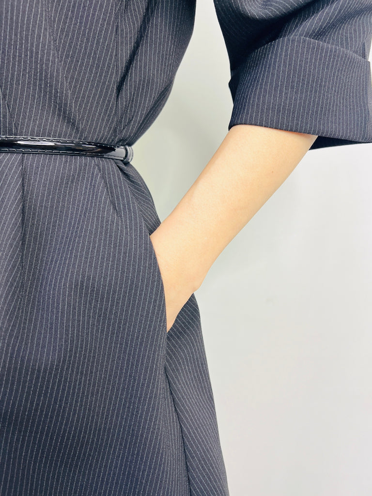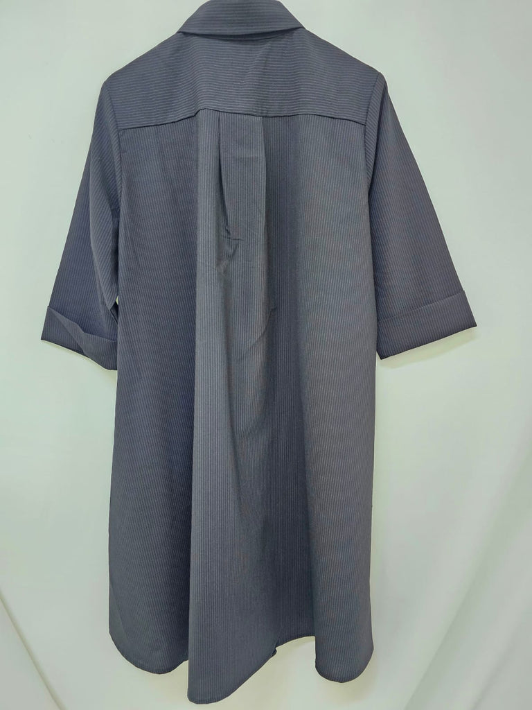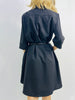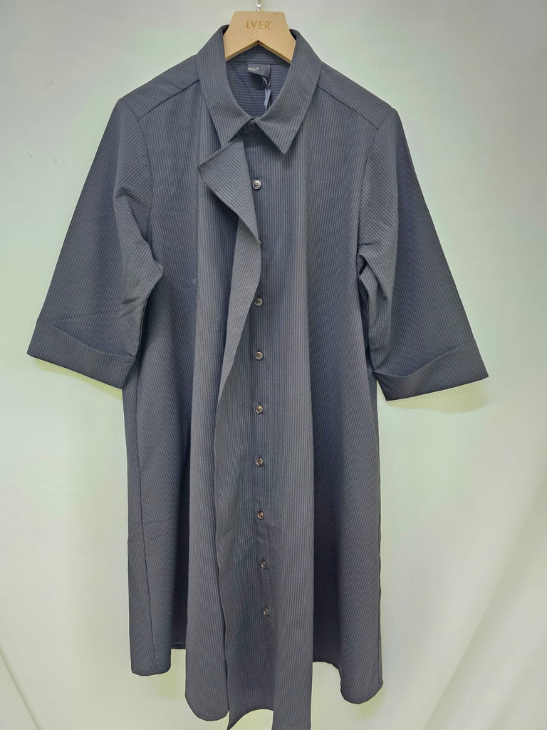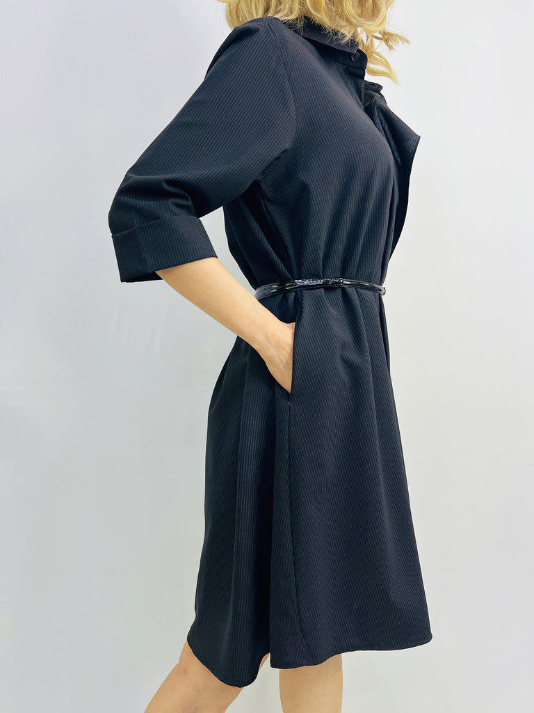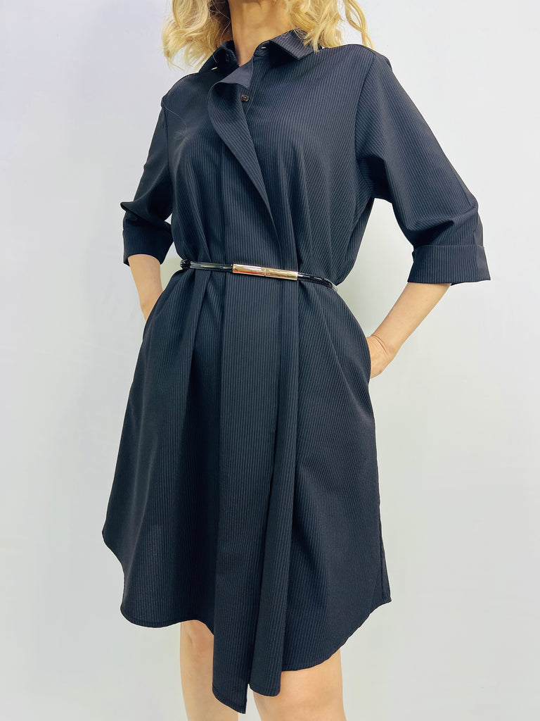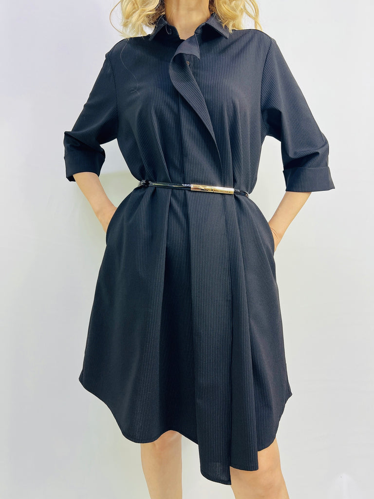 The Ebony Shirtdress features a classic button-front design with a subtly curved hemline, offering a refined silhouette. Wear it flowing freely for an elegant, relaxed look or cinch it at the waist with a belt to enhance your shape and add a tailored touch. Versatile and polished, this dress transitions effortlessly from day to evening wear.